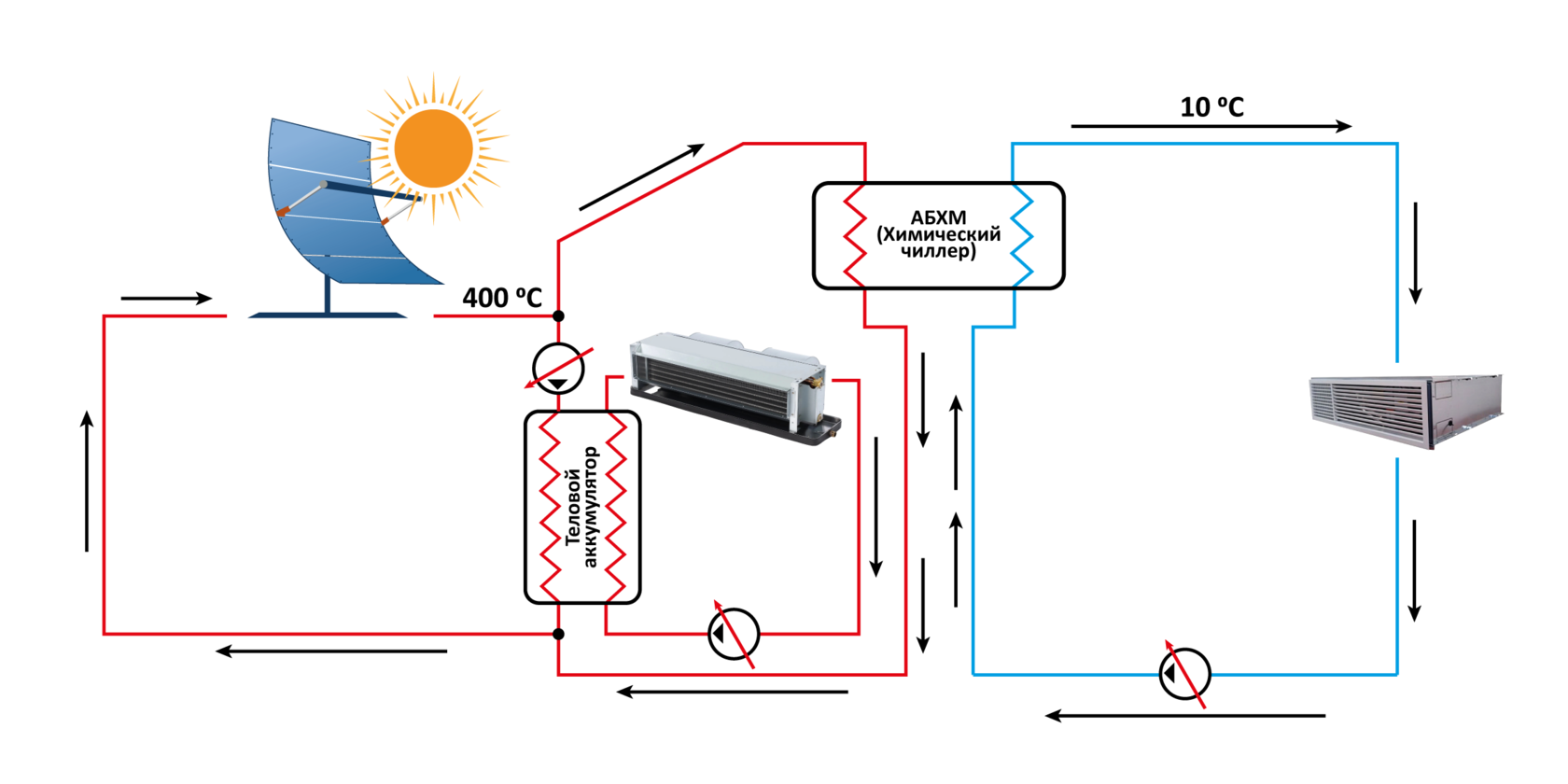Оборудование, работающее от тепловых аккумуляторов, предлагает широкий спектр возможностей: с одной стороны, солнечное тепло способно приводить в действие двигатели, работающие по прямому циклу Стирлинга или Ренкина, в целях выполнения парокомпрессионного цикла, с другой - обеспечивать работу систем, использующих способность веществ поглощать пары хладагента из испарителя, получая эффект охлаждения по принципу, аналогичному традиционному парокомпрессионному циклу.